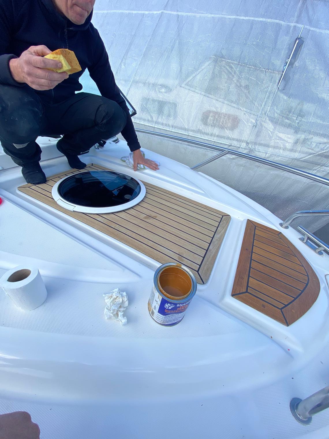 Vi arbetade med en Uttern-båt som hade blivit försummad under flera år. Först tvättade vi hela båten med vårt eget tvättmedel. Därefter utförde vi tester med olika rubbingmedel och använde Merzenas Cut Compound för att behandla hela friborden. Vi fortsatte sedan med att applicera Merzenas Onestep och avslutade med Premium Protection för att skydda ytan. Efter att allt hade vaxats fortsatte vi med teakdäcket. Vi började med att behandla det med Snappy Teak 1&2 och lät det torka en dag. Sedan masserade vi i Snappys Teakwax.